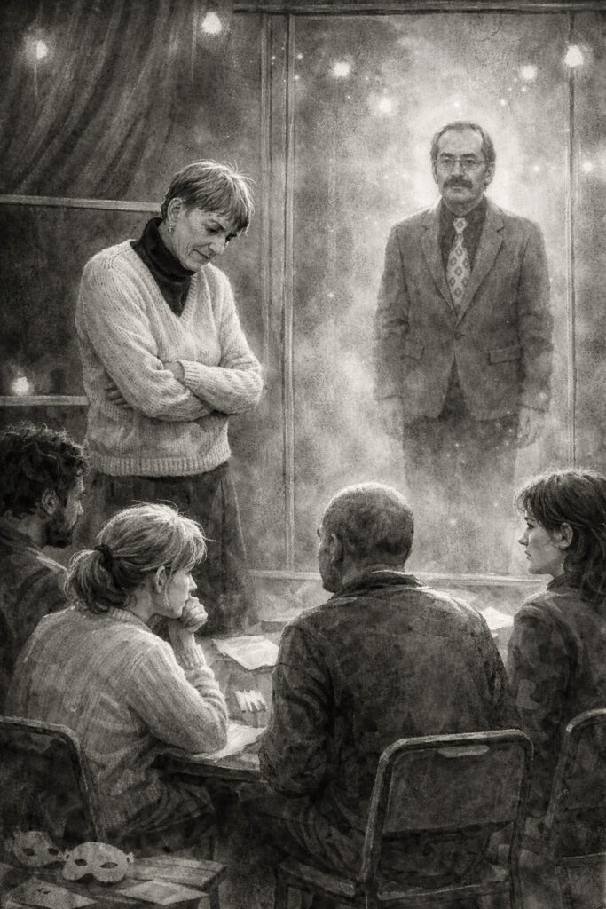 Mit folgendem Prompt hatte ich die KI gefüttert, nachdem was ich von der Erzählung der Träumerin in Erinnerung behalten hatte. „Gestalte eine Traumillustration im Stile der www.Traumdatenbank.de : Darin gibt eine Theaterpädagogin etwas geknickt einen theaterpädagogischen Kurs mit 4 Teilnehmern. Hinter einer Glasscheibe steht der verstorbene Bruder der Theaterpädagogin. Er ist ein wenig kleiner und steht aufrecht, während er dem Kurs zuschaut.“