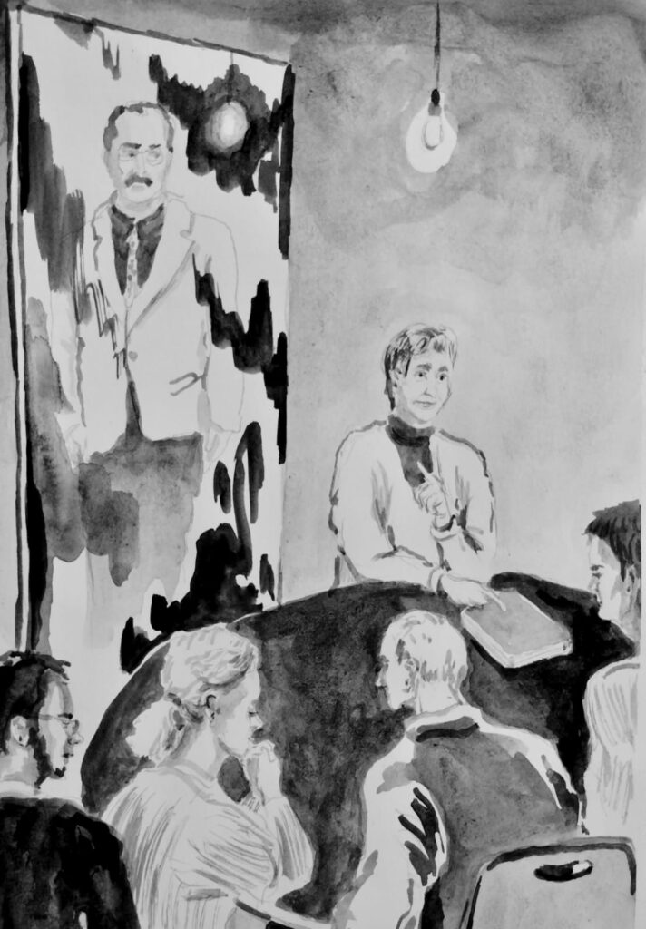 Daraufhin wurde die Erzählung mit folgenden Worten korrigiert und ich fertigte eine Tuschezeichnung danach an – auch weil mich der Bruder an den iranischen Dichter Fereydun Farrochsad erinnerte, der im Exil in Deutschland ermordet wurde: